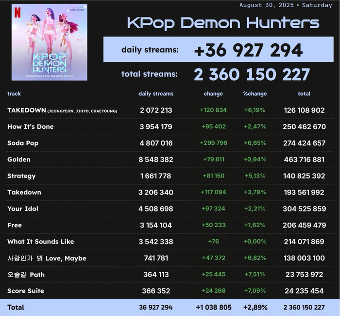 此外,该片音乐在全球流媒体平台的表现同样亮眼,Spotify数据中,原声带每首歌的播放次数都破亿,自7月以来几乎每周都稳居Spotify全球专辑榜冠军。